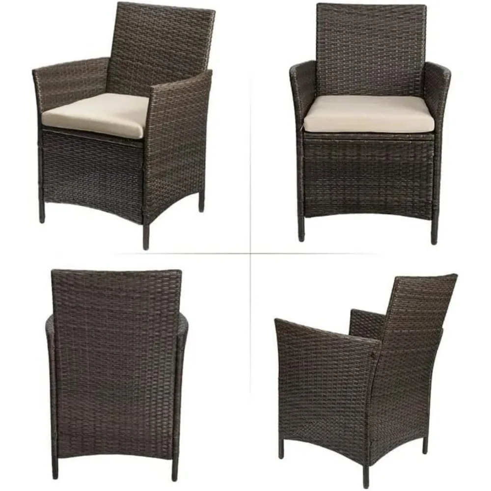 - High Quality Material: The powder coated steel frames are rust resistant and the high quality weather resistant PE rattan won't fade. Each patio furniture seat can support up to 330 pounds.The table in the patio set is made of high quality tempered glass, which is strong yet lightweight and easy to clean.