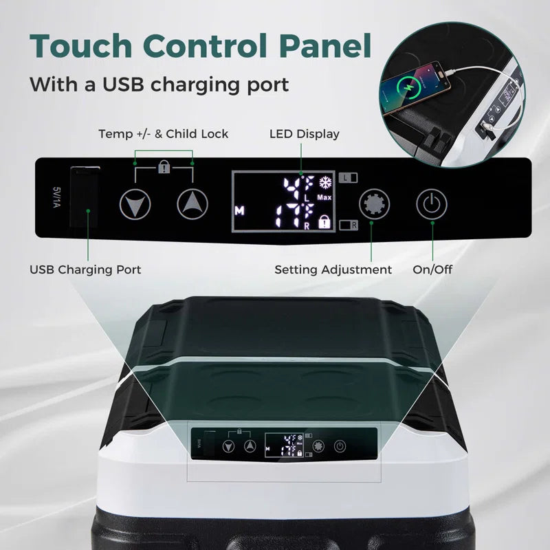 Featuring dual-zone design with independent temperature control from -4℉ to 68℉, this fridge ensures perfect storage conditions for a variety of items, such as beverages, fruits, seafood, meat, vegetables, skincare, etc. Equipped with a powerful compressor, this car freezer can quickly cool down to 32℉ in just 10 minutes. Users can enjoy versatile power supply options with included 12/24V DC and 100-240V AC power cords, suitable for home and outdoor use in vehicles, boats, trucks, and more.