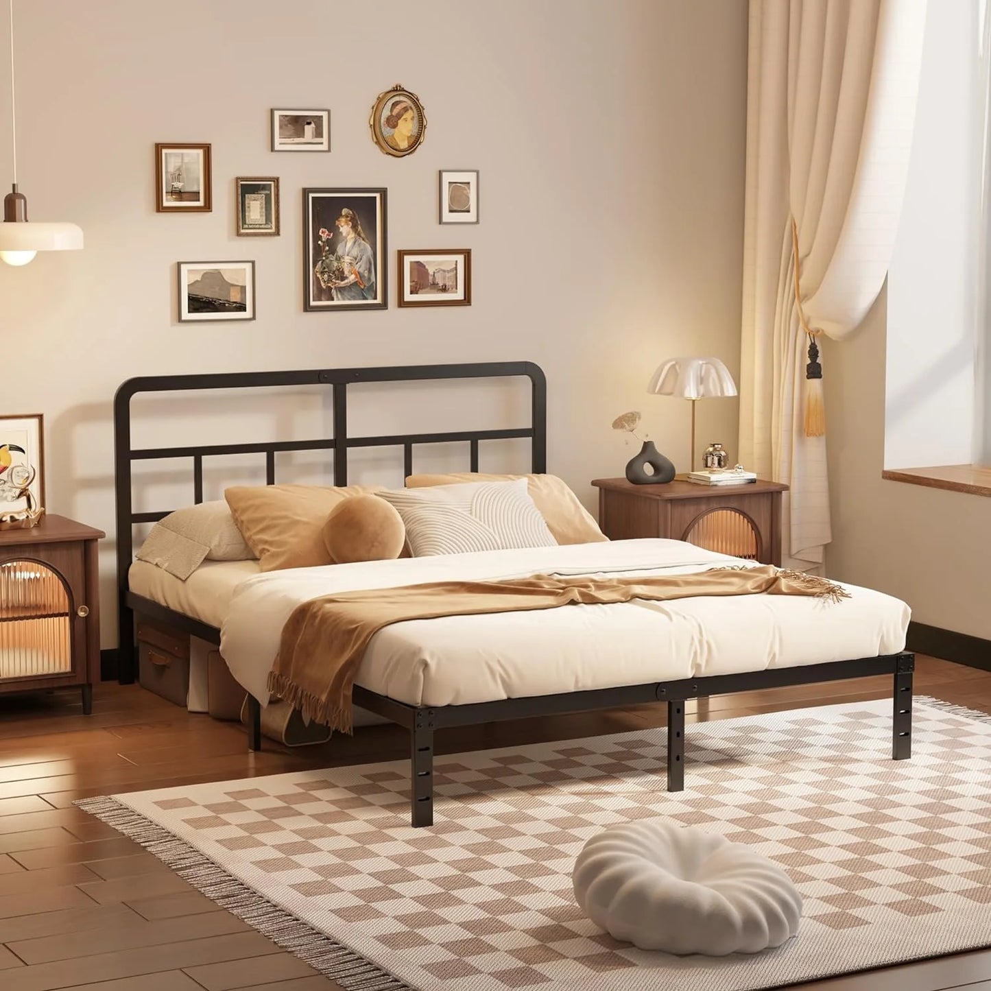 Brand: Maenizi Product dimensions: 83.5"L x 71.5"W x 40"H Maenizi iron bed is the best bed furniture for you Metal bed frame is a must for every family! Whether you sleep alone or with two people, this bed frame will be the best choice for you! Under bed storage: A 14-inch gap under the bed provides plenty of space for storing clothes and clutter to keep your bedroom organized. Simple assembly: The bed is easily constructed, all parts are clearly labeled, and assembly tools and instructions are neatly packed in a box. You can do it in about 20 minutes. Suitable for a variety of interior styles: Use this bed frame in a bedroom at home to save space while giving the family a comfortable place to rest. The versatile frame design allows this bed to blend into a variety of Spaces, including bedrooms, study rooms and more.
