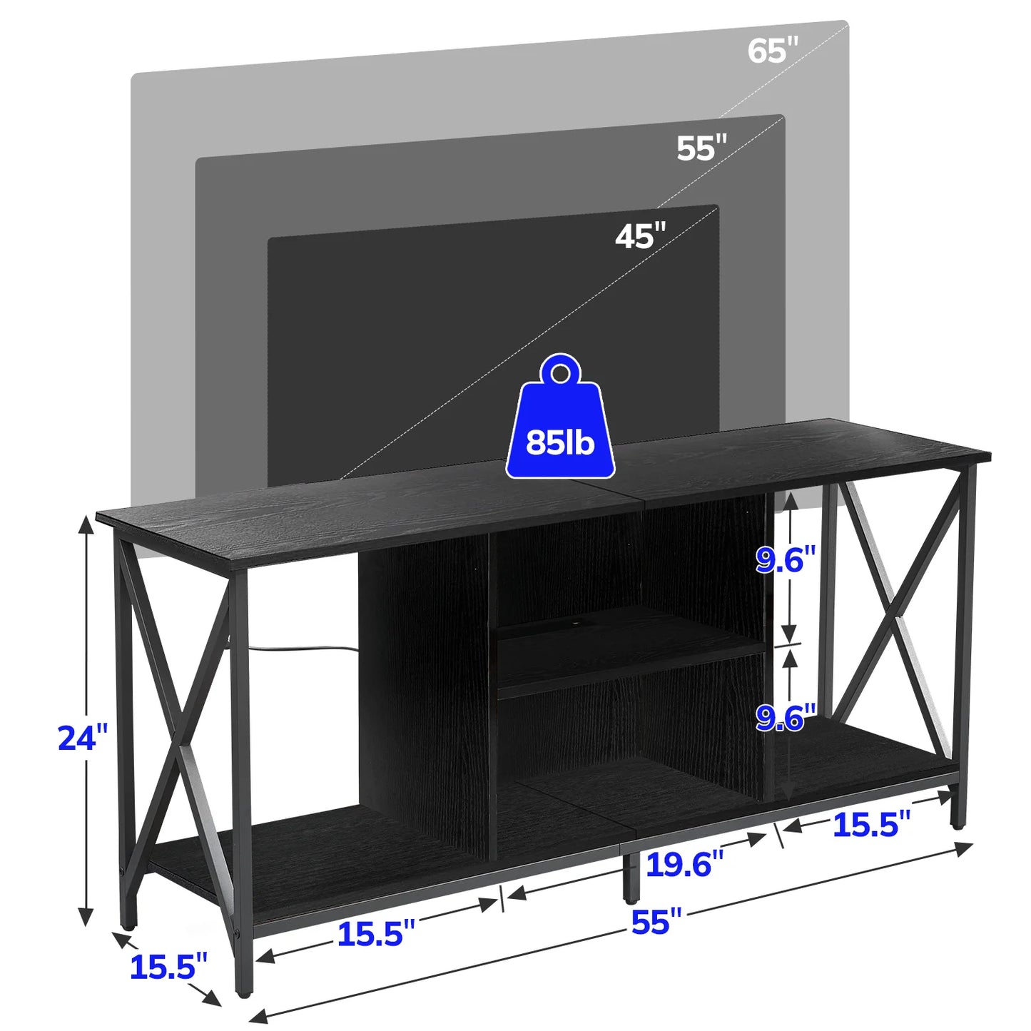 STURDY TV STAND CONSOLE – X-shaped reinforced frame and thickened TV cabinet panels provide better weight-bearing capacity and unparalleled visual impact. The TV stand top can hold up to 150 lbs. The Metal is covered by corrosion resistant paint to prevent rust, and to prolong the service life.